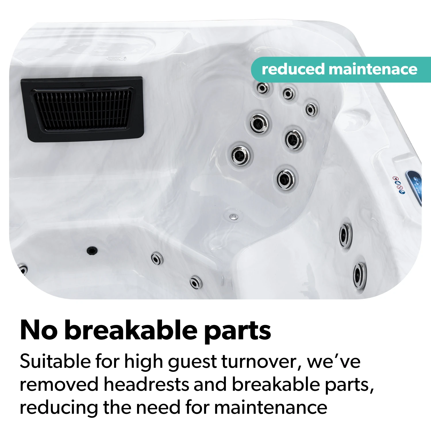 Tamper-proof controls ensure guests can only operate essential features like jets and lighting, preventing unnecessary wear and reducing maintenance callouts.